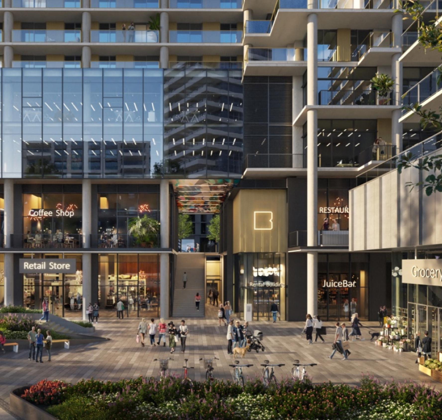 Complete with a community centre which includes two full-sized gymnasiums, a fitness centre, running track, multi-purpose rooms and classrooms, childcare spaces, a rooftop outdoor basketball court, and play area.