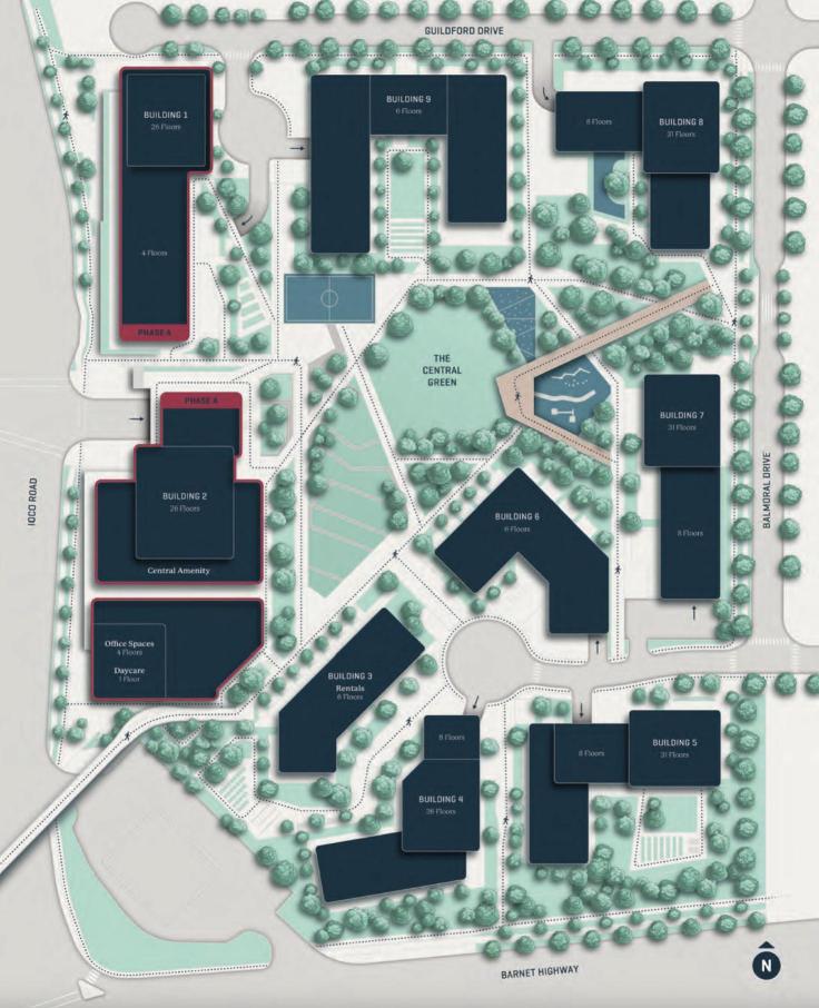 Featuring 4.64 acres of parks and public spaces, 95,722 square feet of retail and office space, and a daycare facility spanning 9,586 square feet for 194 children, all essentials are easily accessible.