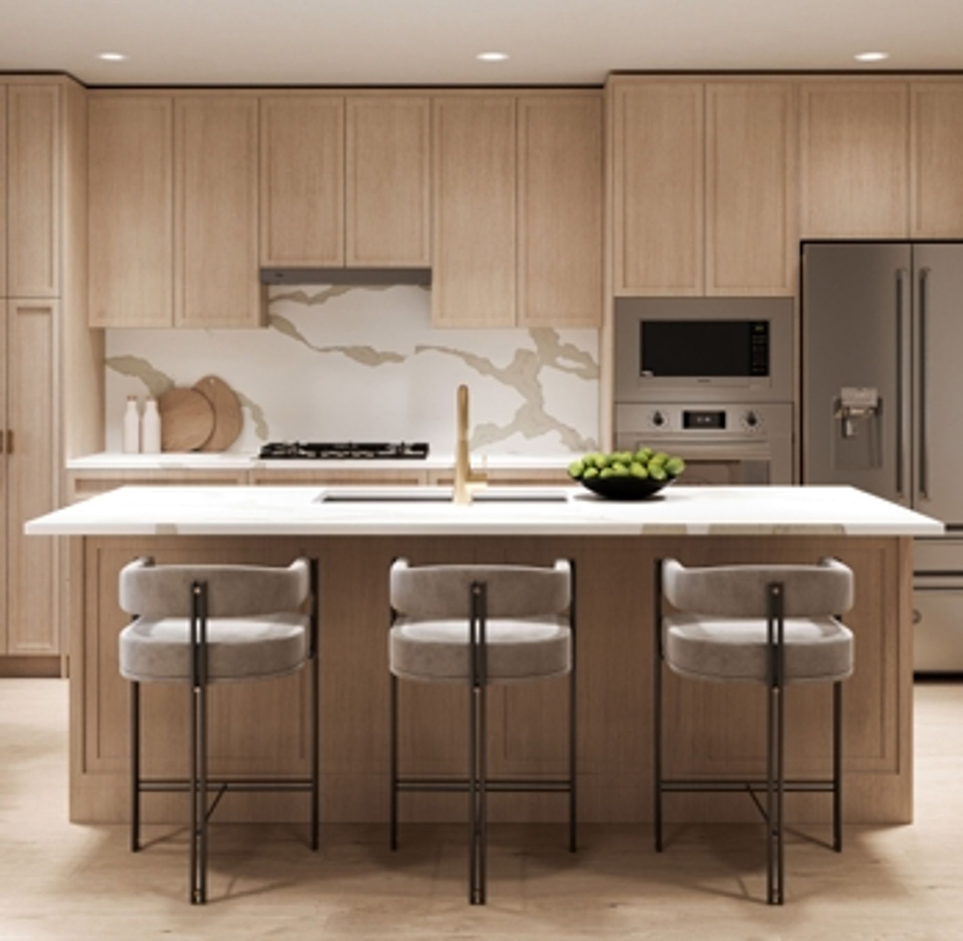 - Kitchens have quartzite countertops & full slab backsplashes