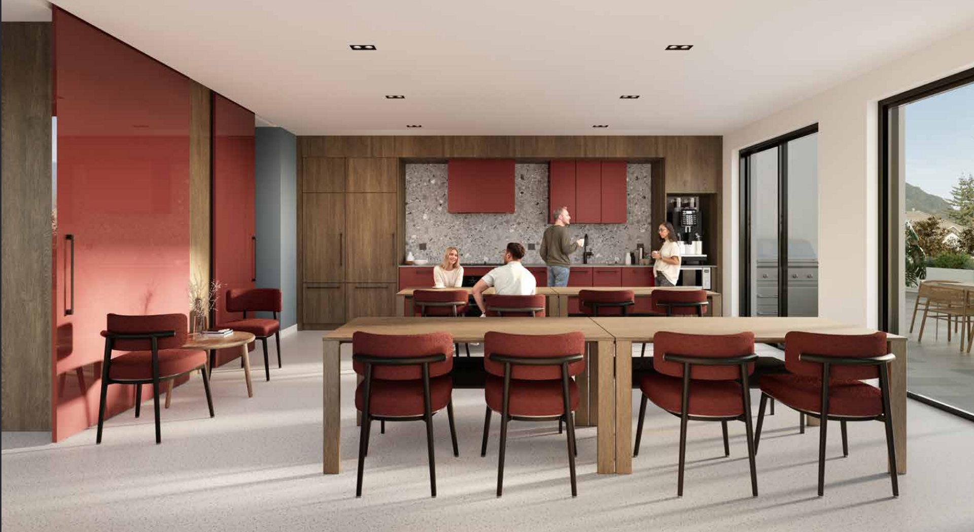 Homes feature Fulgor Milano appliances, Breda induction cooktops, quartz finishes, terrazzo-style flooring, and Samsung in-suite laundry, with two refined interior schemes to choose from. Every residence includes a dedicated bike/ski storage wall and EV-ready parking.