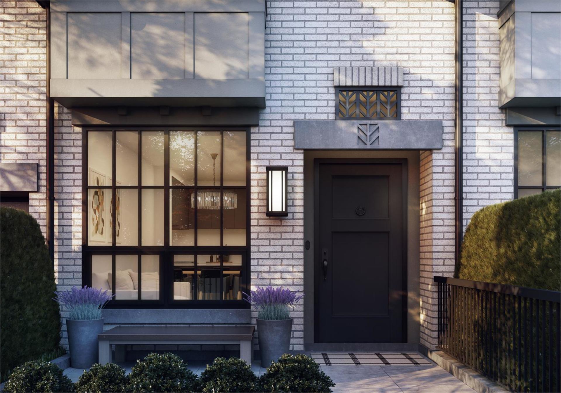 Building Type: 40 unit townhouse project. These classically designed, family oriented homes have outstanding street appeal, with heritage inspired details like the crisp white brick exteriors and black metal accents. A lot of attention has been paid to the landscaping to provide a sense of privacy and lushness.
