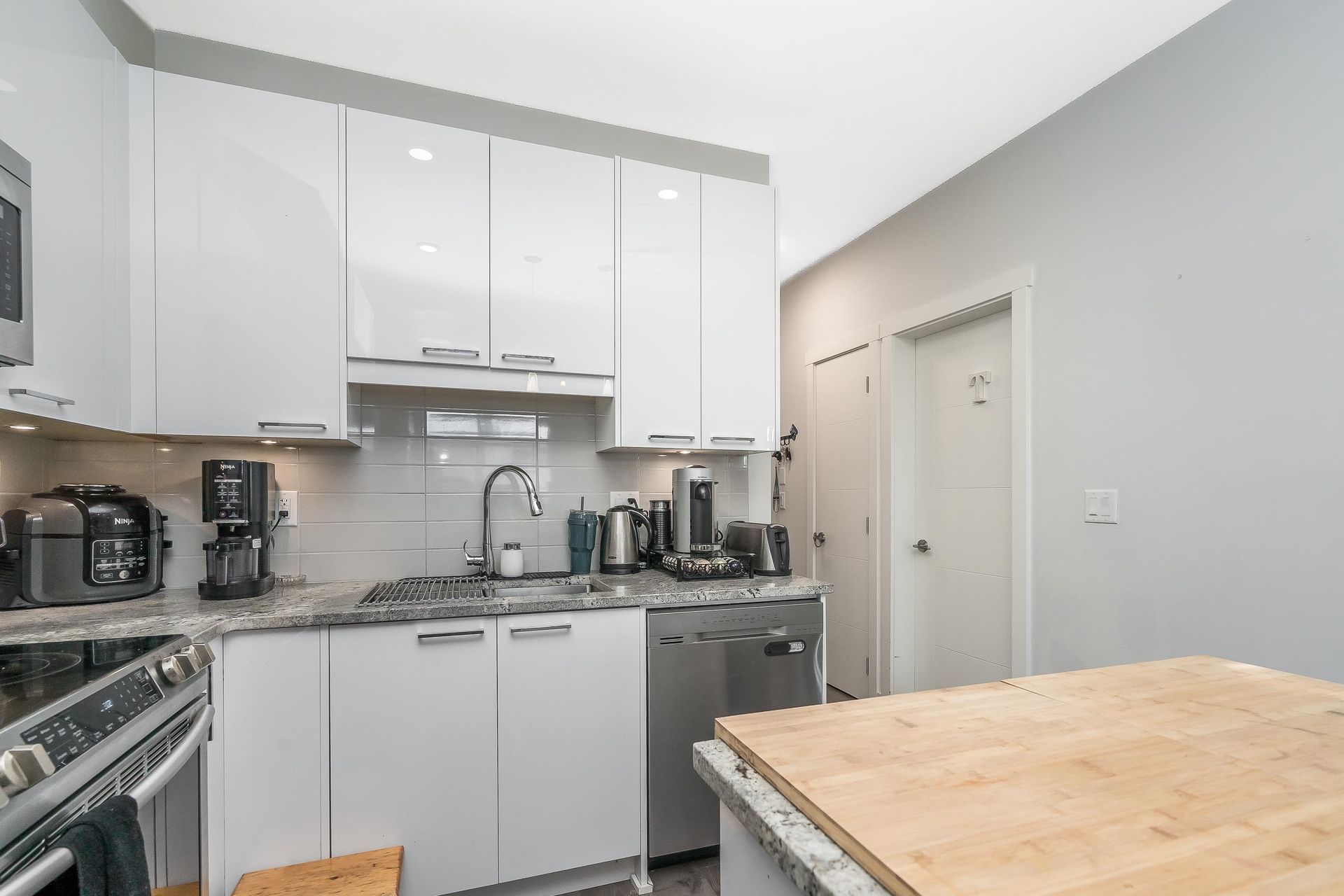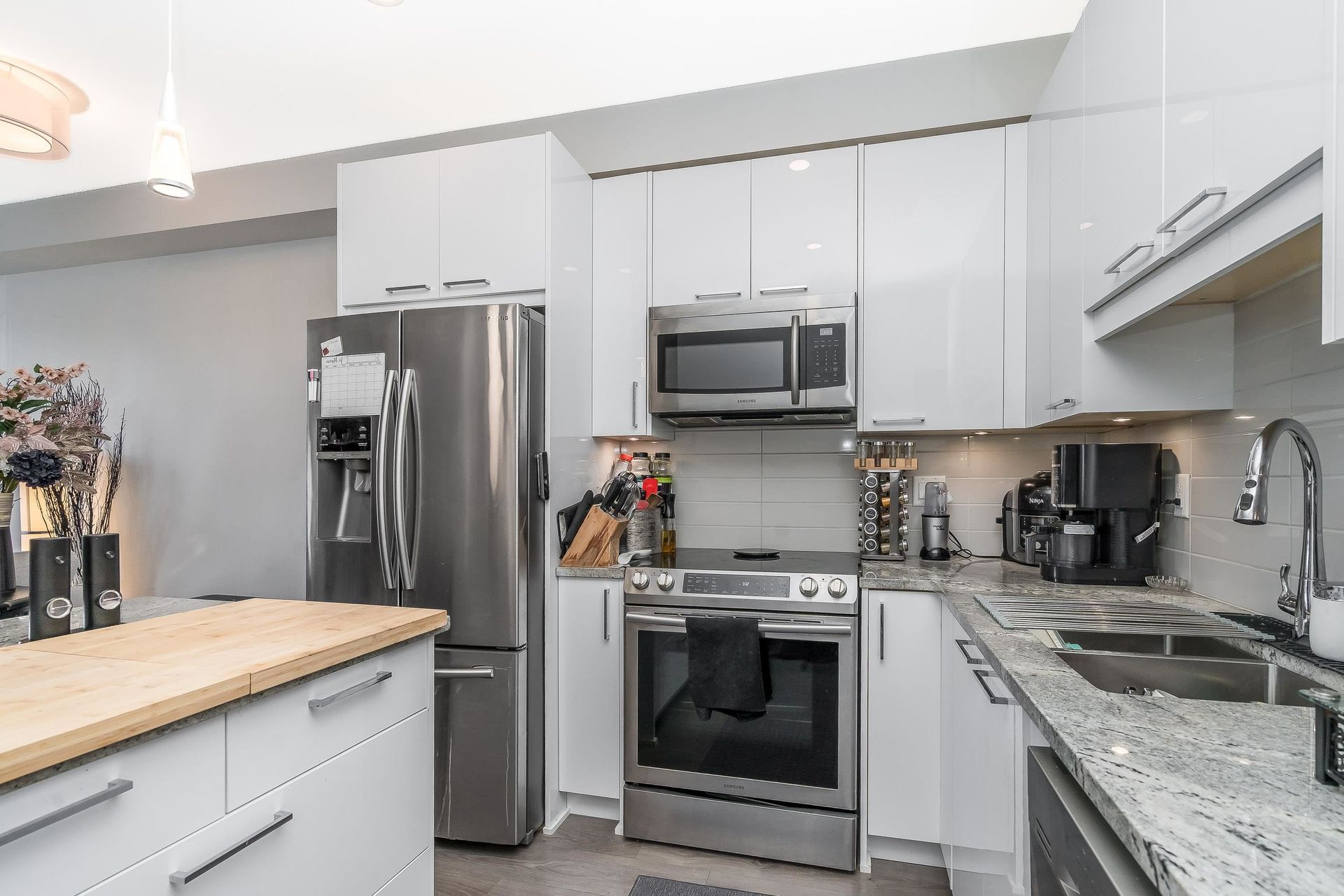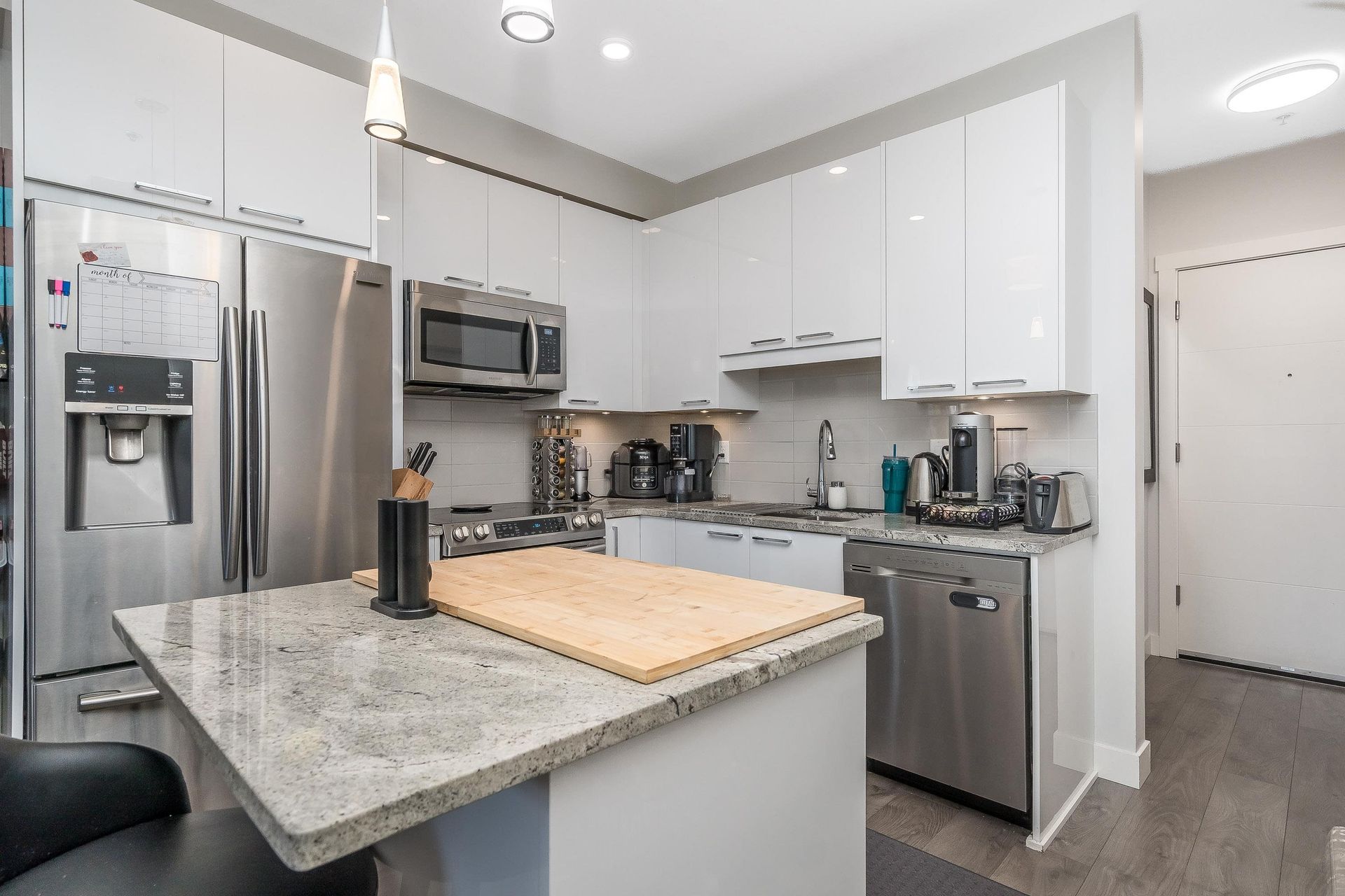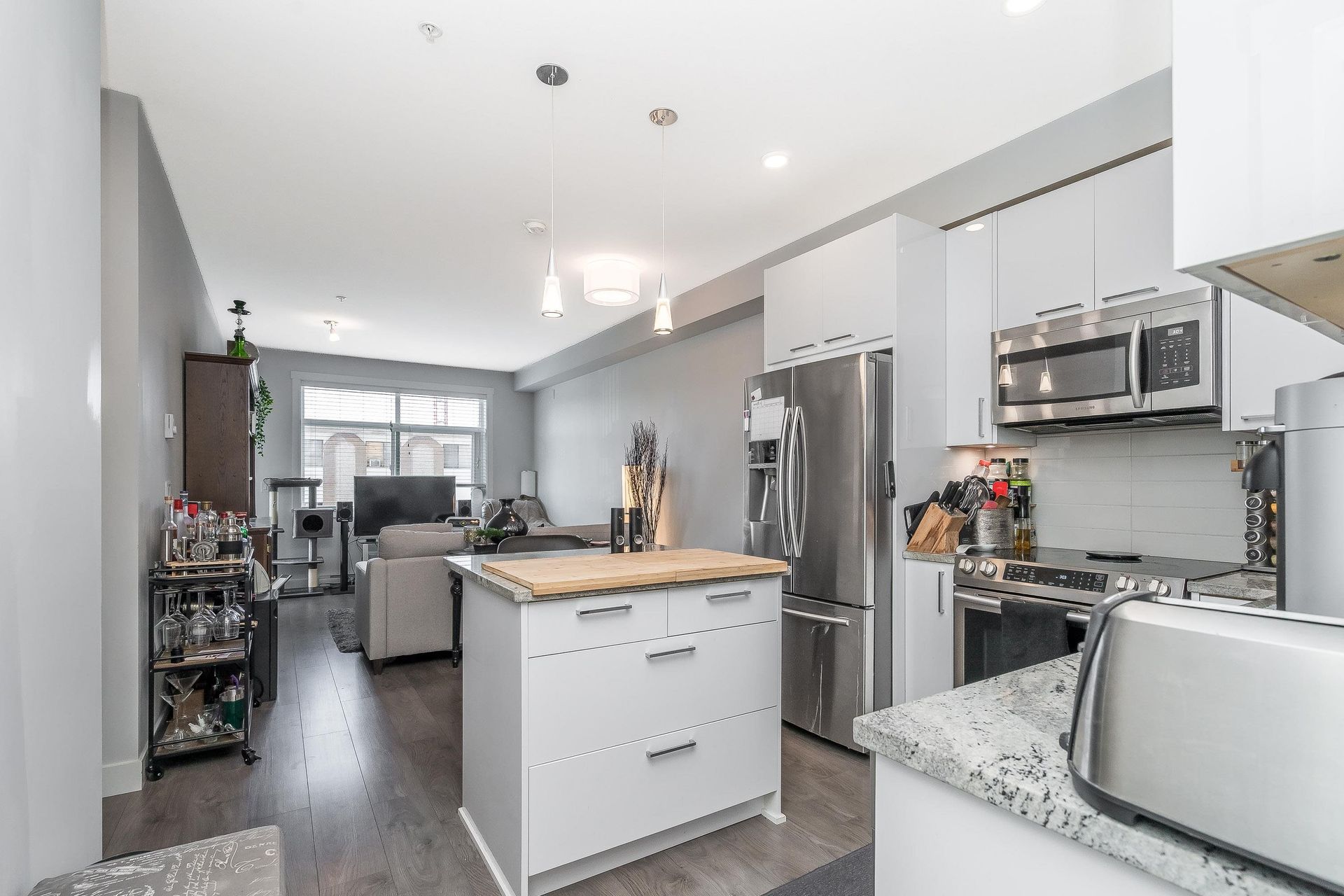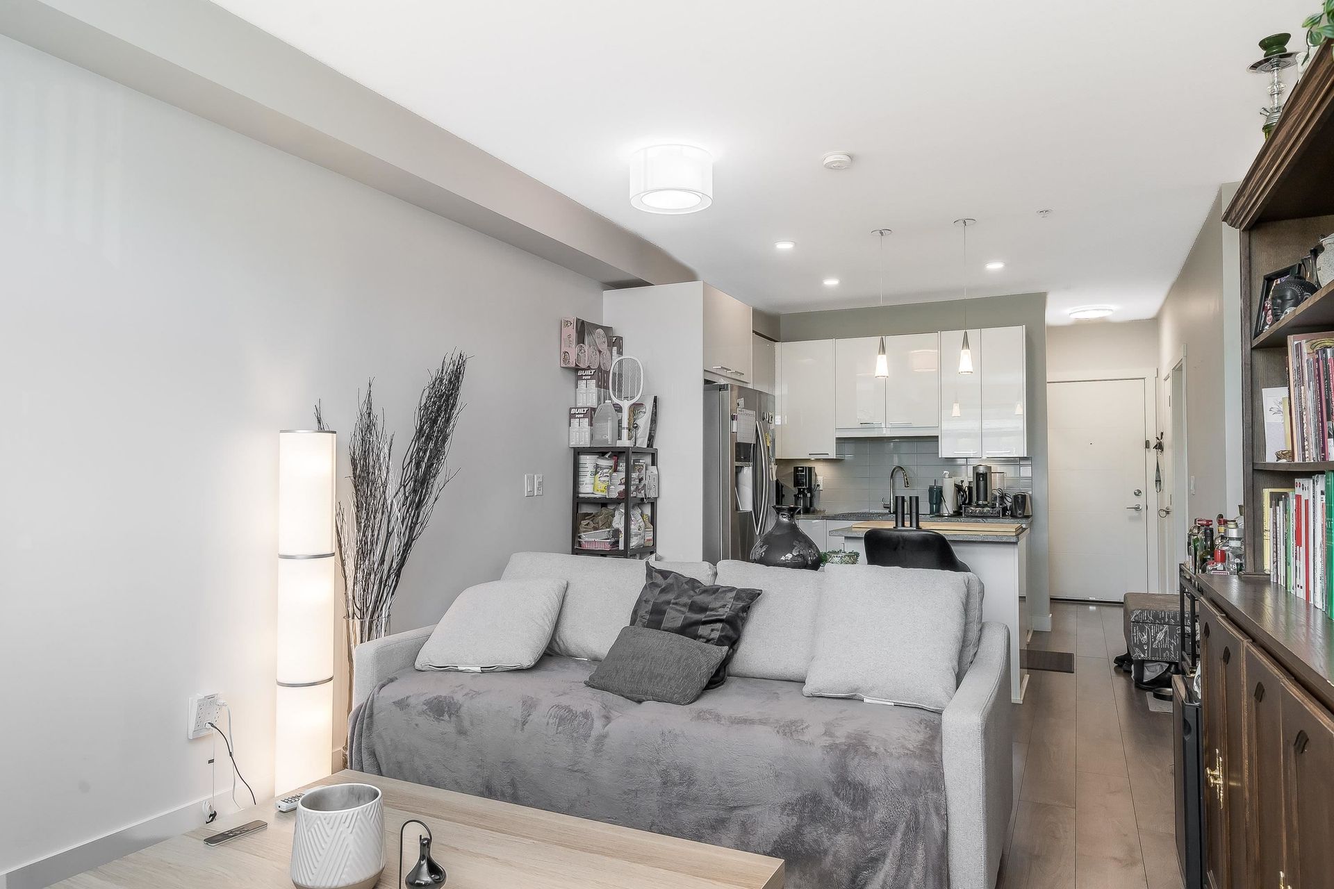 Welcome to "The Georgia" by Whitetail Homes—this spectacular 2 Bed + Den, 2 Bath corner unit is only a few blocks to the future Skytrain! Featuring 9' ceilings, an open concept layout, and top-tier finishes including granite counters, stainless steel appliances, and high-quality laminate throughout. The Den is perfect for a home office or extra storage. The spacious primary bedroom offers a walk-in closet, ensuite with double sinks, and A/C. Pet friendly building includes 1 parking, 1 locker and access to bike storage and EV charging. All this in a prime location—close to shopping, restaurants, and schools. A must-see! OPEN HOUSE - SAT. JULY 19 11am-1pm.