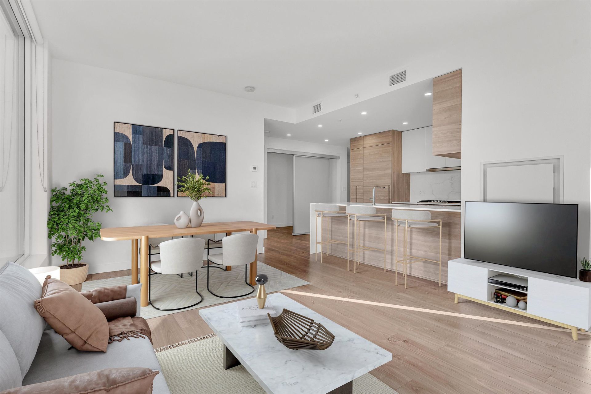 Kitchen offers generous cabinets including pull out pantry, integrated full size Bosch appliances & quartz countertops and slab backsplash.