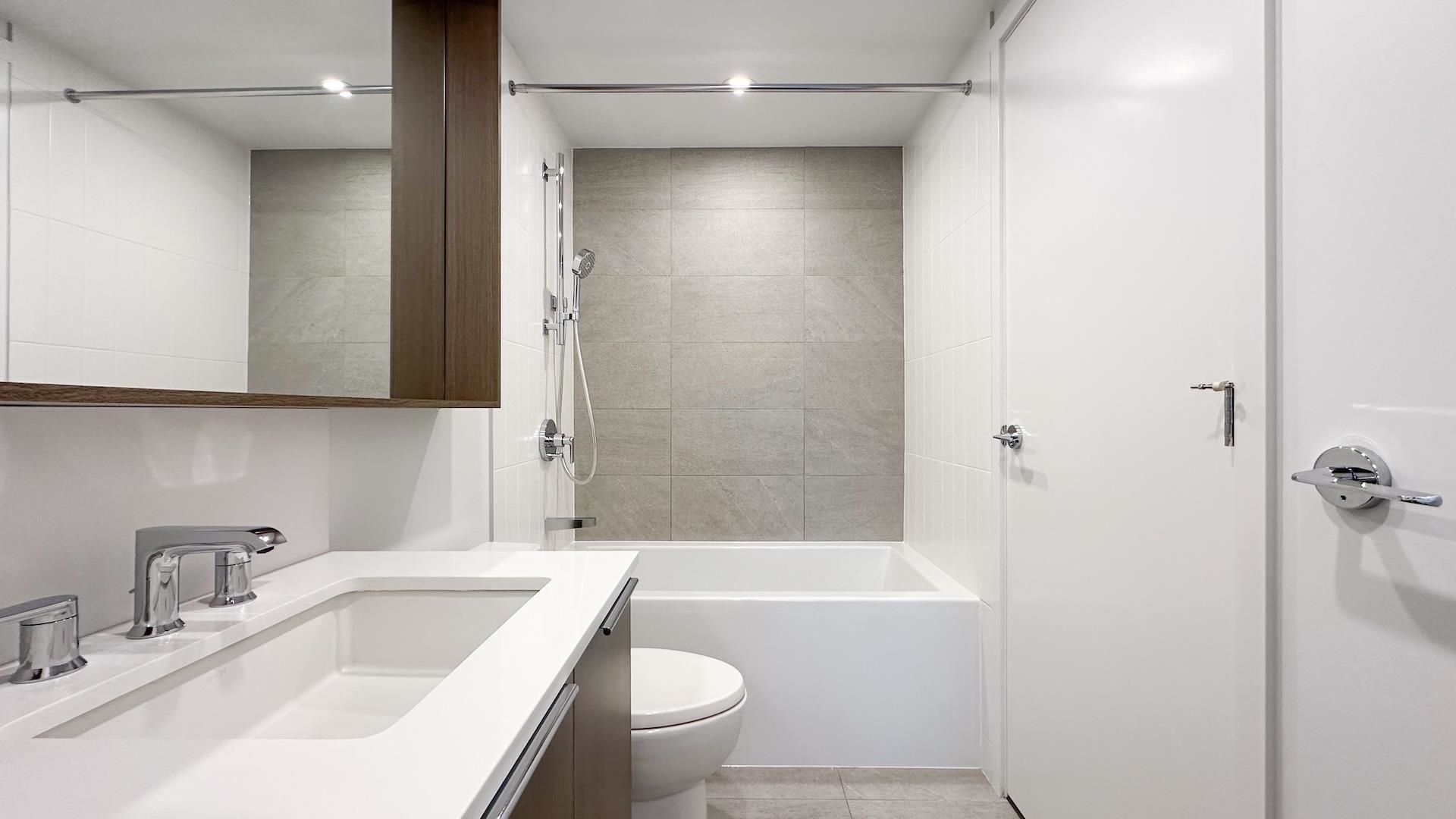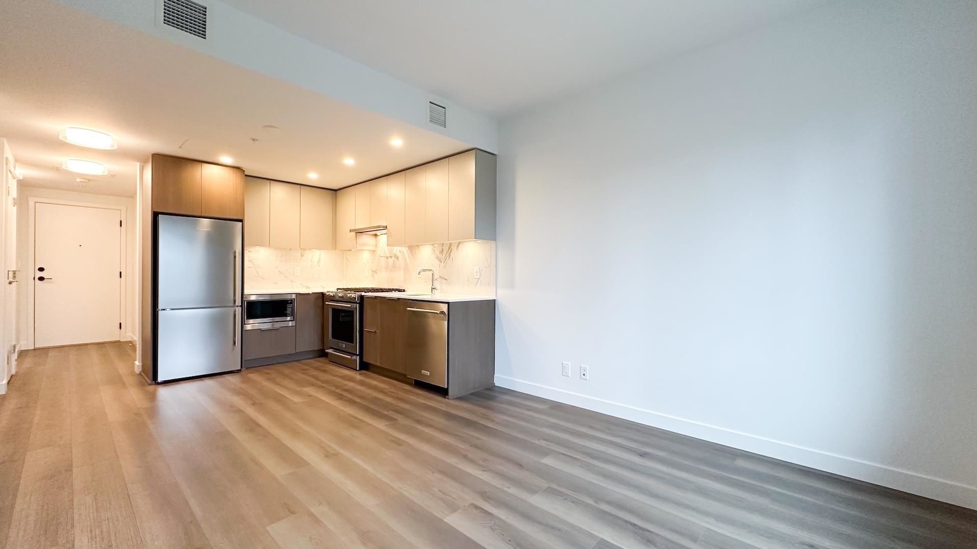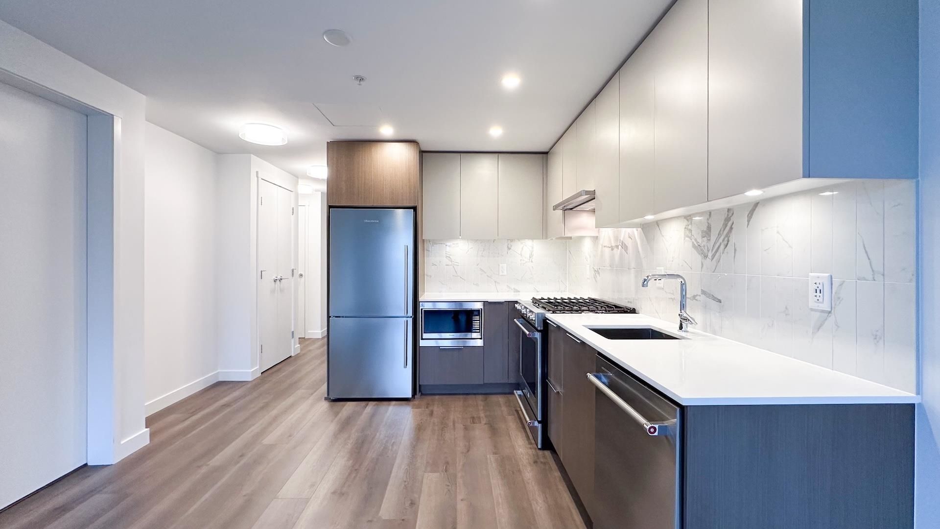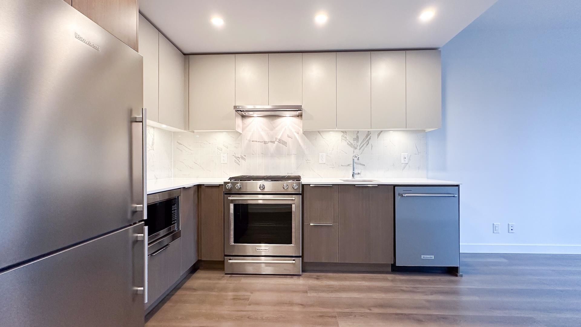 South facing 1 bedroom + den home feels brand new! L-shaped kitchen features full size Kitchen Aid & Blomberg appliances and quartz countertops.