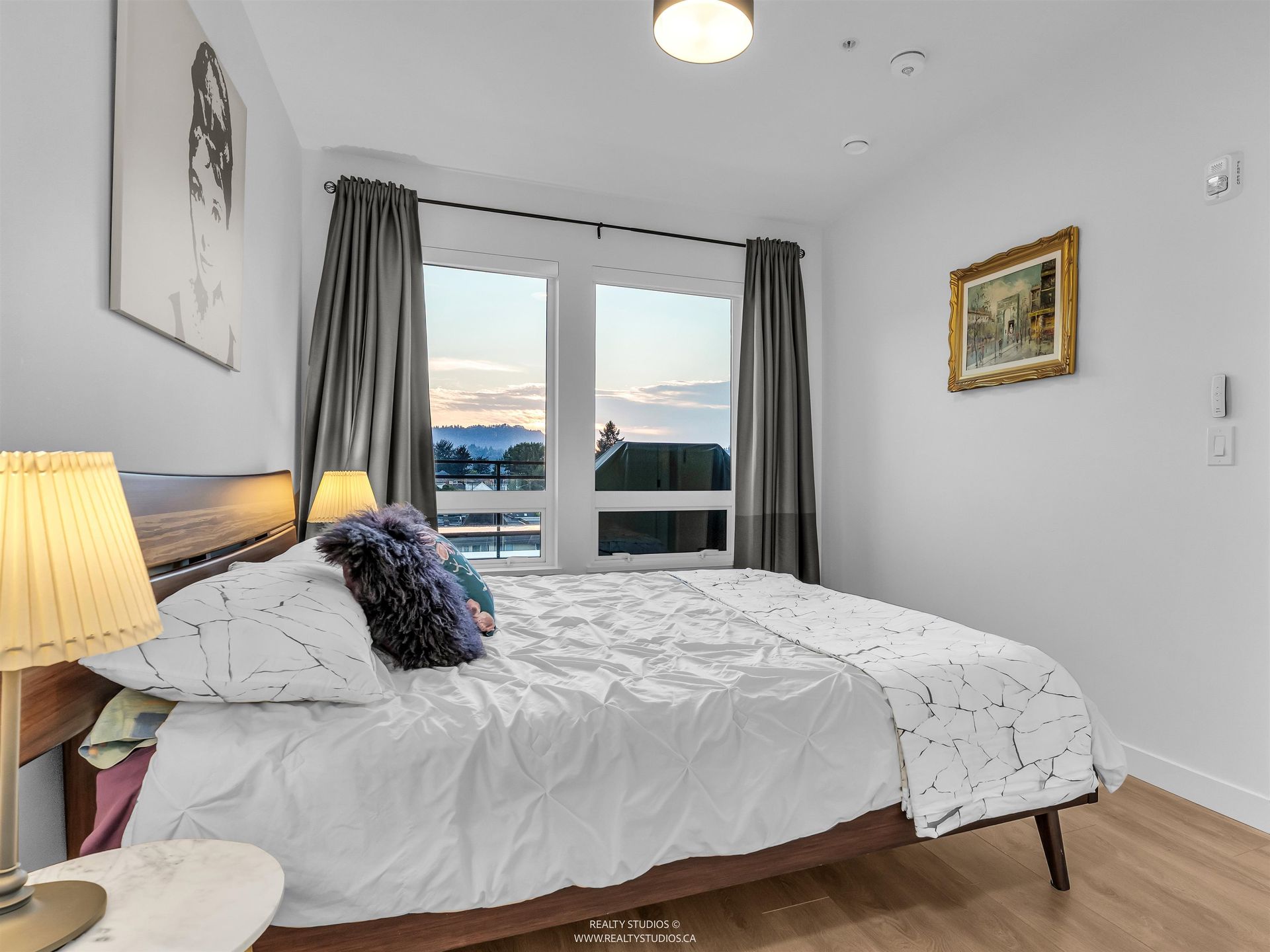 Spacious 2 bed, 2 bath penthouse condo in the George by Marcon in Port Moody. Enjoy the spectacular sunsets and Mountain views ( partial ocean views) from the large balcony. Open floorplan with high ceilings and great light! Air conditioned. Full sized stainless steel appliances including a gas stove. Tons of storage! Motorized roller blinds throughout. Blond oak laminate flooring. Both bedrooms are large enough for a king sized bed and have spacious walk in closets. Primary bedroom is ensuite with radiant in-floor heating and double vanities. Laundry room has side by side washer and dryer. Two parking stalls and a large private storage room. Located just 5 minutes away from both Moody Centre SkyTrain Station and the West Coast Express. Balance of new home warranty. Pet friendly building.